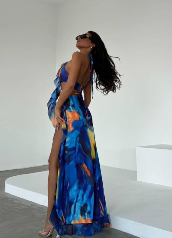 Aura Modist Boyundan Bağlamalı Derin Yırtmaçlı Volanlı Dijital Baskılı Şifon Maxi Elbise