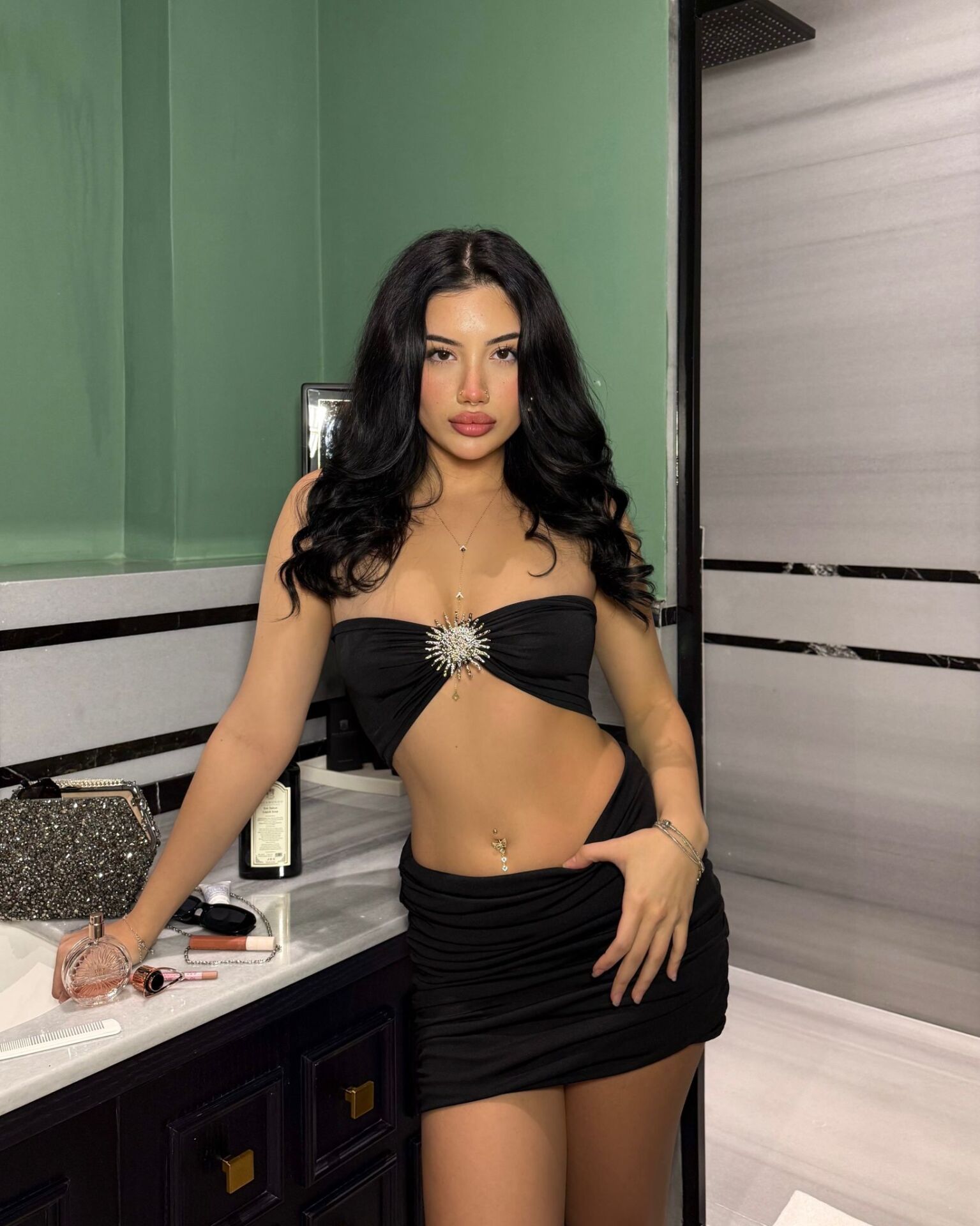 Ürün Açıklaması: Gecenin enerjisini üzerinizde taşıyın! Aura Modist Güneş Aksesuarlı İkili Takım, cesur dekoltesi ve ikonik güneş figürüyle stilinize sanatsal bir dokunuş katıyor. Straplez büstiyerin merkezindeki ışıltılı aksesuar, tüm bakışları üzerinize çekerken; vücudu saran drapeli mini etek, kusursuz bir silüet sunar. Özel partiler ve iddialı gece etkinlikleri için gardırobunuzun en çarpıcı parçası olmaya aday.