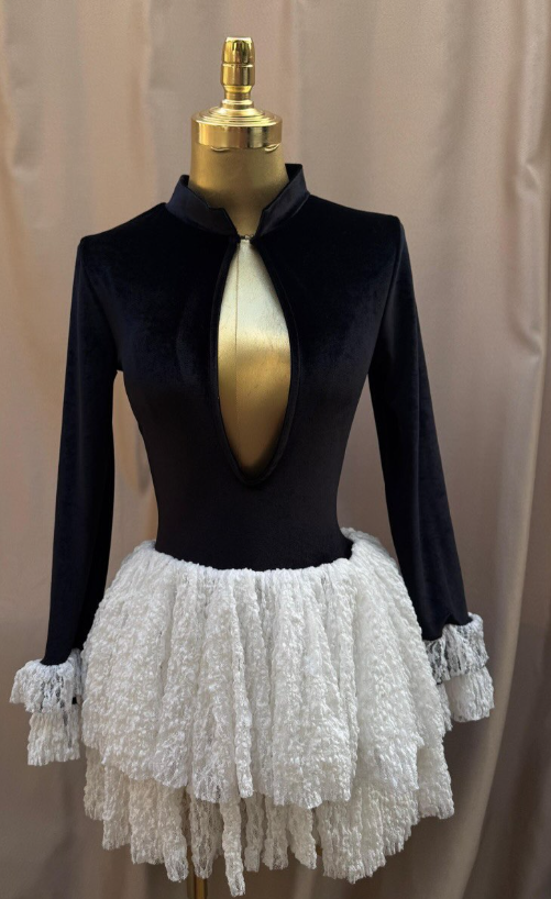 Aura Modist'in yeni sezon koleksiyonunda öne çıkan bu elbise, dokusuyla büyüleyen siyah kadife ve romantik beyaz dantelin eşsiz birlikteliğini sunuyor. Üst bedeni saran esnek kadife kumaş, cesur göğüs dekoltesi ve dik yaka detayıyla modern bir silüet oluştururken; kollardaki ve etekteki kat kat dantel işlemeleri elbiseye feminen bir hava katıyor.