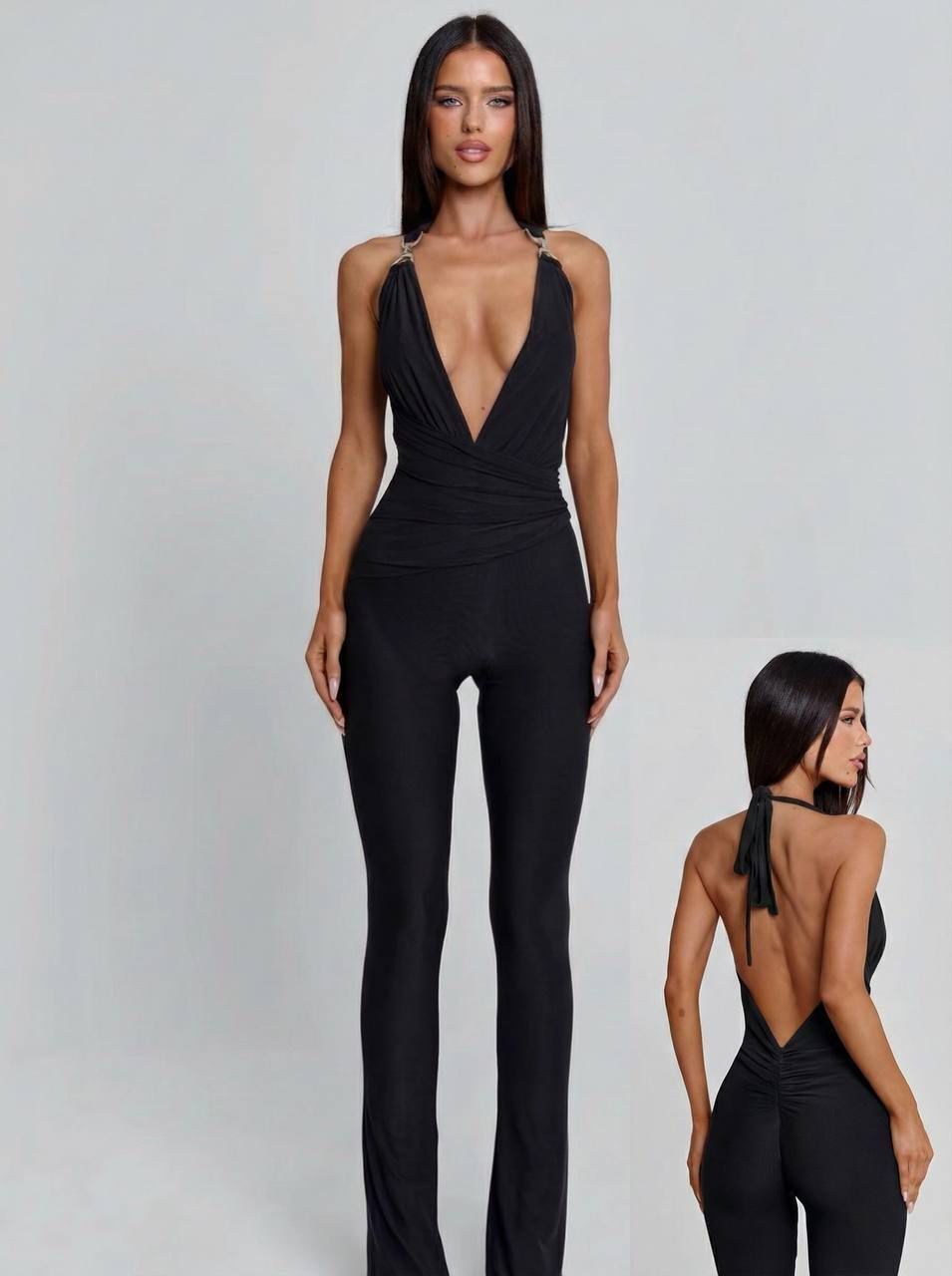 Aura Modist Kadın Boyundan Bağlamalı Derin Dekolteli ve Sırt Detaylı Tulum