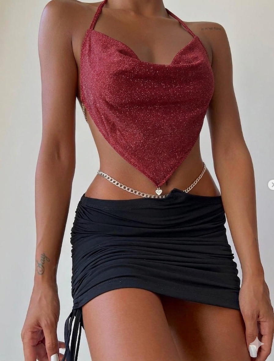 Tasarım: Boyundan bağlamalı, derin sırt dekolteli ve zincir detaylı büstiyer; yanlardan büzgülü, vücudu saran mini etek.