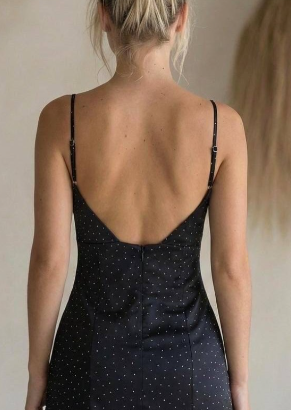 Tasarım Detayları: İnce ayarlanabilir askılar, vücudu saran form ve derin 'V' kesim sırt dekoltesi.
