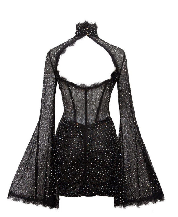 3. Ürün Açıklaması Gecenin En Işıltılı Silüeti! Aura Modist koleksiyonunun en göz alıcı parçalarından biri olan bu mini elbise, kristal taş işlemeleri ve dramatik İspanyol kollarıyla zarafeti yeniden tanımlıyor. Modern kesimi, klasik dantel dokusuyla birleşerek size eşsiz bir gece stili sunuyor.